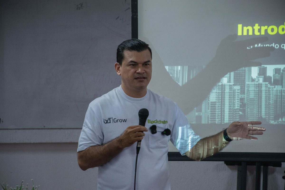 Él enfocó su ponencia en la seguridad y los riesgos de invertir. Primero, nos ayudó a entender el concepto de Blockchain con una analogía, dijo: el blockchain es como un libro de notas compartidas, en el que cualquier cambio debe ser aprobado por todos los que participan. Luego nos habló de algunos riesgos de invertir online: el Phishing, la suplantación y las contraseñas débiles.
