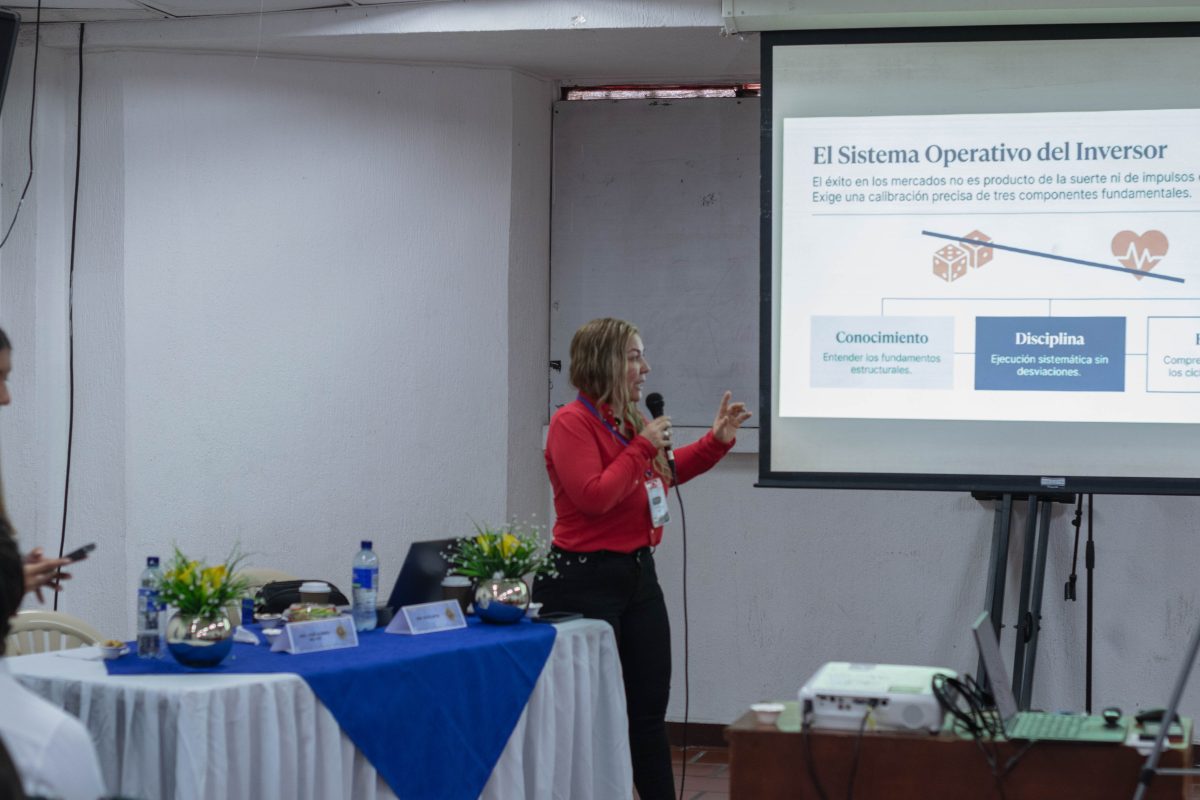 La ponente nos expuso que para tener éxito en las finanzas es fundamental el control emocional. No se trata solo de dinero, sino de mentalidad. Recalcó 3 claves para lograr el éxito finaciero: