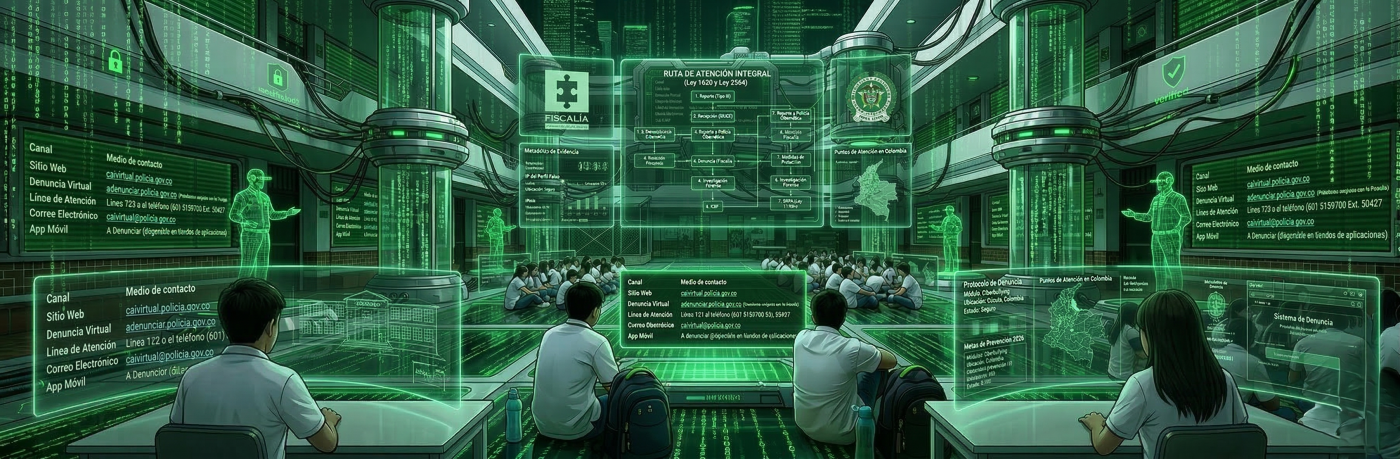 Una vez identificada el tipo de falta, se inicia un proceso restaurativo. En caso de ser tipo II, la institución educativa puede encargarse de establecer medidas para restaurar la convivencia. En caso de que la falta sea tipo III, se debe remitir al Centro Cibernético Policial. Allí se encargan de los delitos relacionados con el espacio digital y sus implicaciones. La Policía Cibernética, a través del CAI Virtual, actúa como el garante estatal de la seguridad digital. Su intervención es clave para restablecer la tranquilidad psicológica de la víctima y recolectar pruebas siguiendo la Ley 527 de 1999 para que el Sistema de Responsabilidad Penal para Adolescentes (SRPA) procesa con la determinación de la responsabilidad penal.